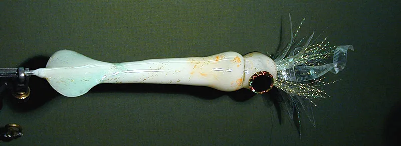 This is the finished squid. All the coloring was done at one time, first a white epoxy/acrylic mixture was applied and then the green and orange acrylic was dabbed into the wet colored epoxy. These colors were chosen from the Irish flag (green, white and orange). This fly took a Direcor's choice at the 2001 Irish Open Fly Tying Championship held in Dublin Ireland. A clear coat of epoxy was applied after the coloring was cured.