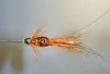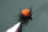 This muddler is tied on a small stainless Mustad hook using orange deer hair, orange dyed grizzly hackle and natural rabbit dubbing with a bit of orange flash mixed in. A small beauty indeed and sooo easy to see at night. |